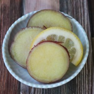 旬のさつまいもをレモンで煮たもの。皮に多く含まれているビタミンC、食物繊維がたっぷり含まれているさつまいも。紫色には抗酸化作用のアントシアニンも。