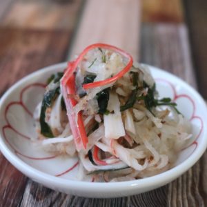 生の大根とワカメを鰹節で和えたもの。大根はしりしり器で千切りにし軽く塩もみをしてわかめと和えたもの。