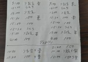双子のタイムスケジュールがどのような流れになっているのかを把握するために、夫はミルク、離乳食、うんちなど二人分のタイムスケジュールを作成。