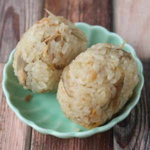 ささがきゴボウ、にんじん、ツナ缶を使った炊き込みご飯のおにぎり。ツナ缶は缶のオイル(汁)をそのまま入れてゴボウ、にんじんと一緒に炊き上げました。