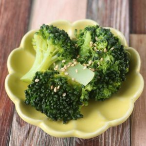 蒸したブロッコリーにごまをまぶしたもの。ブロッコリーを蒸す時は、鍋に少しの水を入れて鶏ガラスープの素を振りかけます。