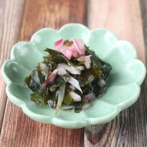 みじん切りにした紫玉ねぎとわかめを酢の物に。紫玉ねぎには、わずかにアントシアニンが含まれているので酸味と合わせると色鮮やかな紫色のに。