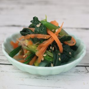 ごまの風味とごま油が美味しい1品です。ほうれん草と人参は緑黄色野菜の代表的な野菜。抗酸化作用がありβカロテンも豊富。