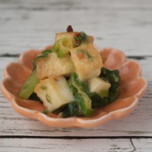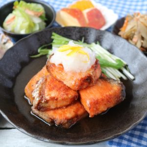 味噌、砂糖、酒、みりん、豆板醤、水で沸騰させたところに厚揚げを入れて仕上げにねぎを入れたもの。ピリ辛味の味噌とねぎの風味の相性が良くご飯がすすむ1品です。