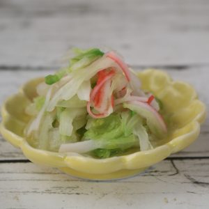 白菜はサッと塩をふってギュ~と絞ってカニカマと一緒に甘酢に漬けたもの。鍋料理に出番の多い白菜ですが、少し残った時に甘酢にして楽しんでいます。