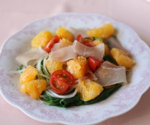 生ハム、オレンジ、ミニトマト、水菜で作ったサラダ。オレンジの黄色、ミニトマトの赤、水菜の緑色にピンク色のなハムで春らしい明るいイメージにしてみました。