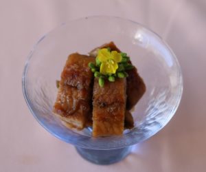 酒をふって蒸した鰻のかば焼きに菜の花をトッピングして春らしさを。
