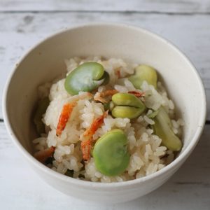 左は白ごまと桜えびのおにぎり。右はそら豆と桜えびの炊き込みご飯。