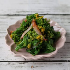 左は菜の花と桜えびのナムル。右は水菜と桜えびのナムル。青菜に桜えびをパラパラっと混ぜるだけ。