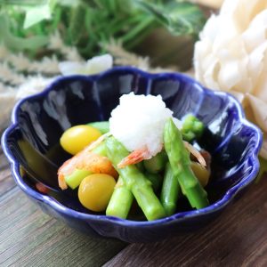 左は小松菜と桜えびの中華和え。右は銀杏、アスパラ、桜えびのみぞれ和え。