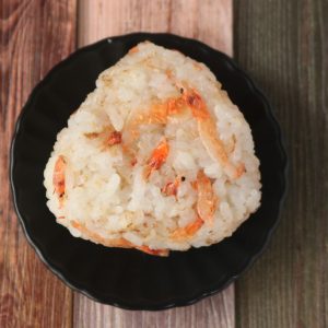 桜えびを白だしに漬けてふやかし、かつお節と混ぜておにぎりにしたもの。