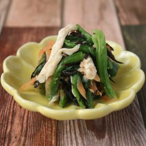 ほうれん草、にんじん、ひじき、蒸し鶏を中華風(鶏ガラスープの素、ごま油)に和えたもの。